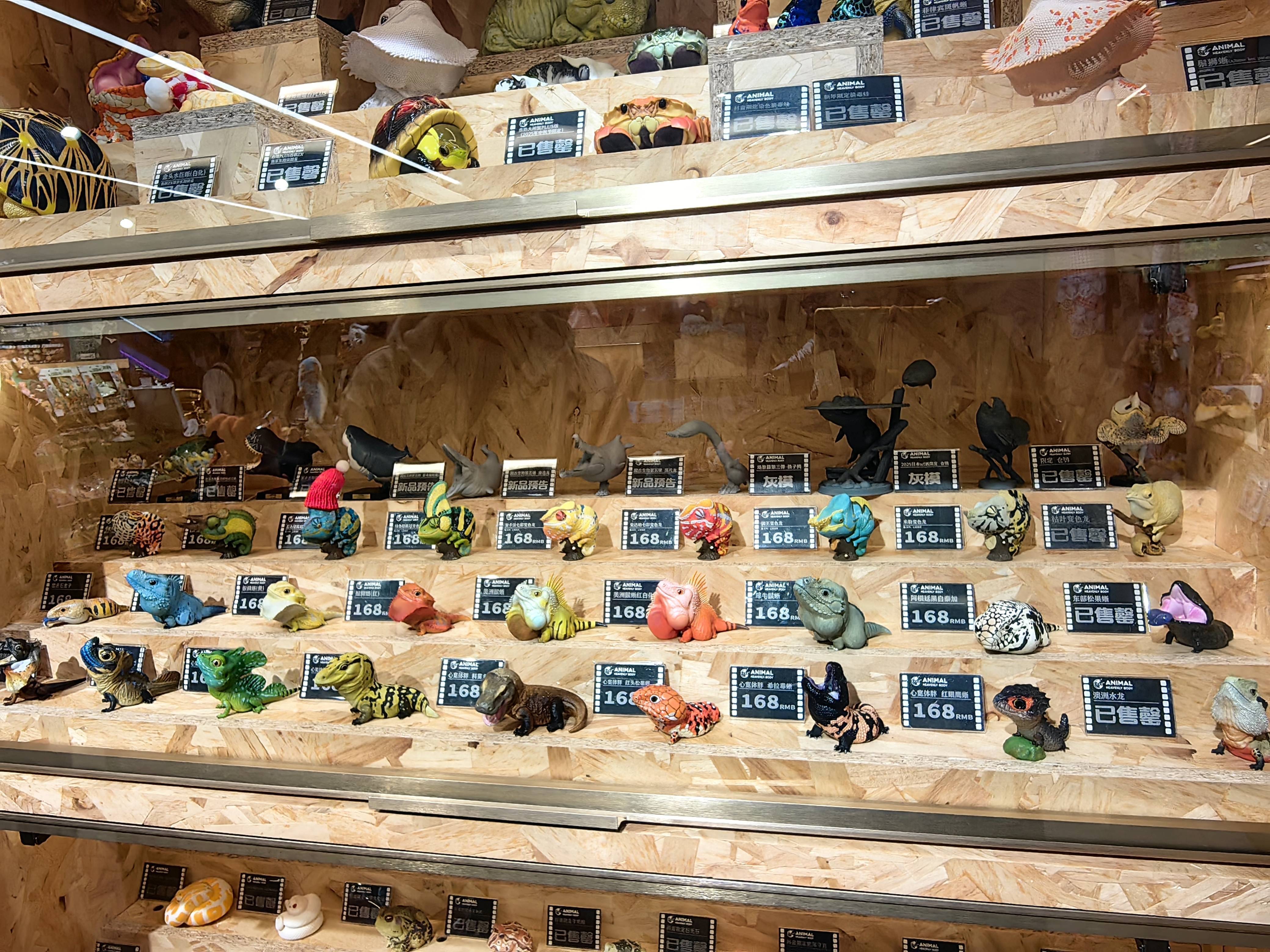 和琳琅满目的“星云海鲜”一样引人注目的,是一整面玻璃墙的动物手办,一个个手掌大小的动物手办,有着圆滚滚的外表,身上的色彩细节栩栩如生。