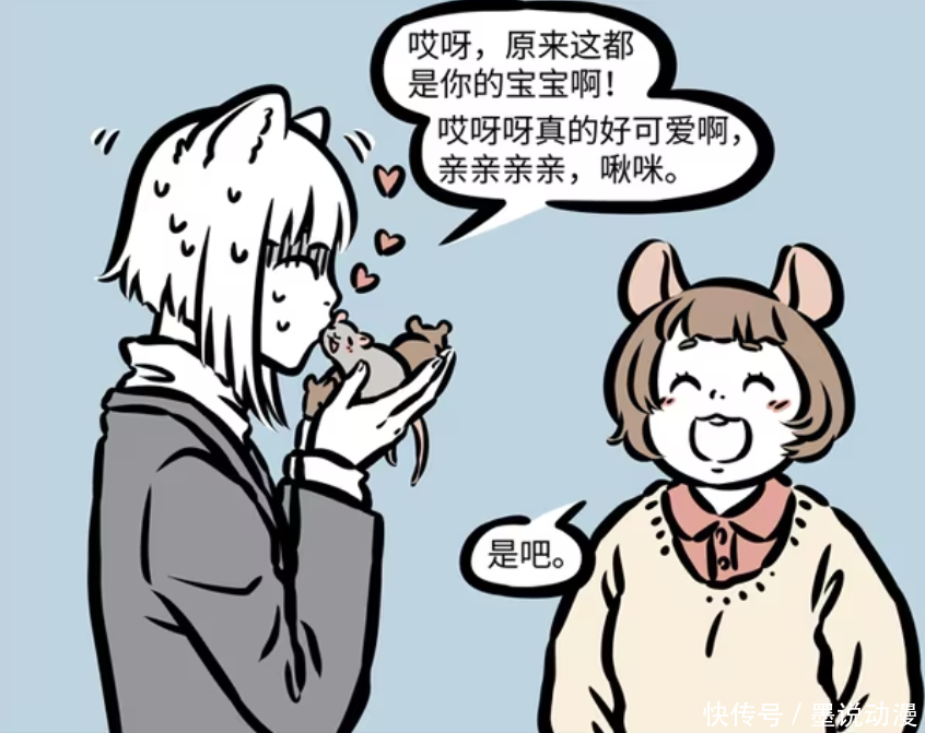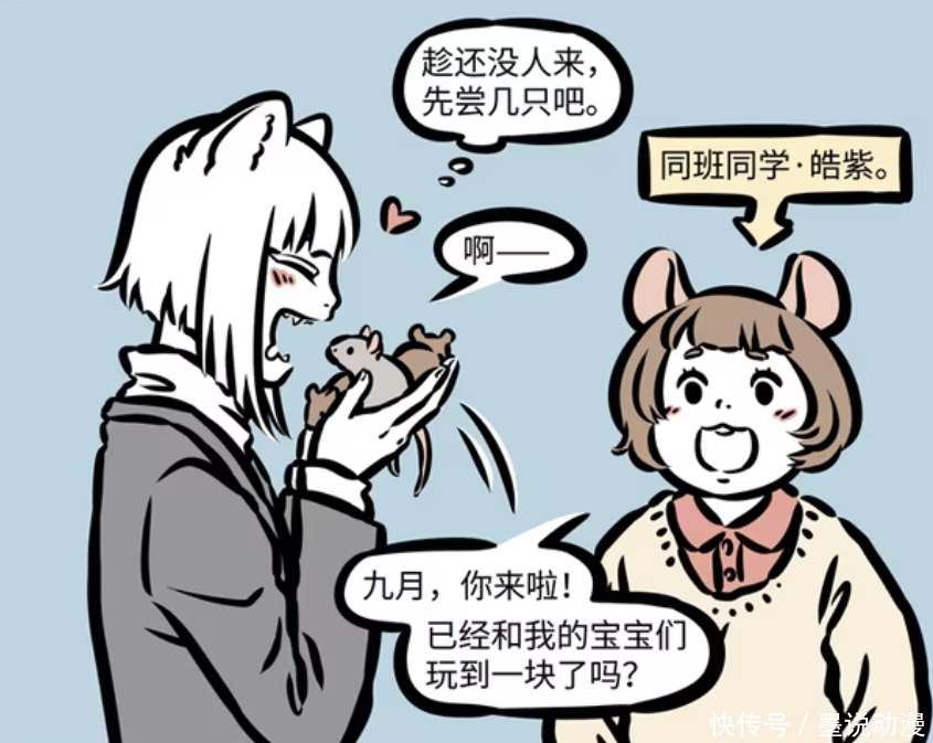 原本九月想吃下去,但知道是同学的孩子之后,只能马上改成亲它一口。为了缓解尴尬的气氛,九月只能夸这些老鼠看起来很可爱,想要亲亲。这么一来,九月才不会被怀疑,而且皓紫看起来很开心。