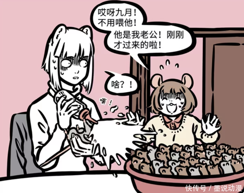 《非人哉》漫画版中,九月曾经参加高中同学会。刚进包间之时,九月发现餐桌上有一盆老鼠,九月误以为是同学给她点的菜,所以将这些老鼠当成食物。在皓紫出现后,九月才知道这些老鼠是她的孩子。后续九月帮忙照顾皓紫的孩子,不过把皓紫的老公当成了她的孩子,也喂了起来。