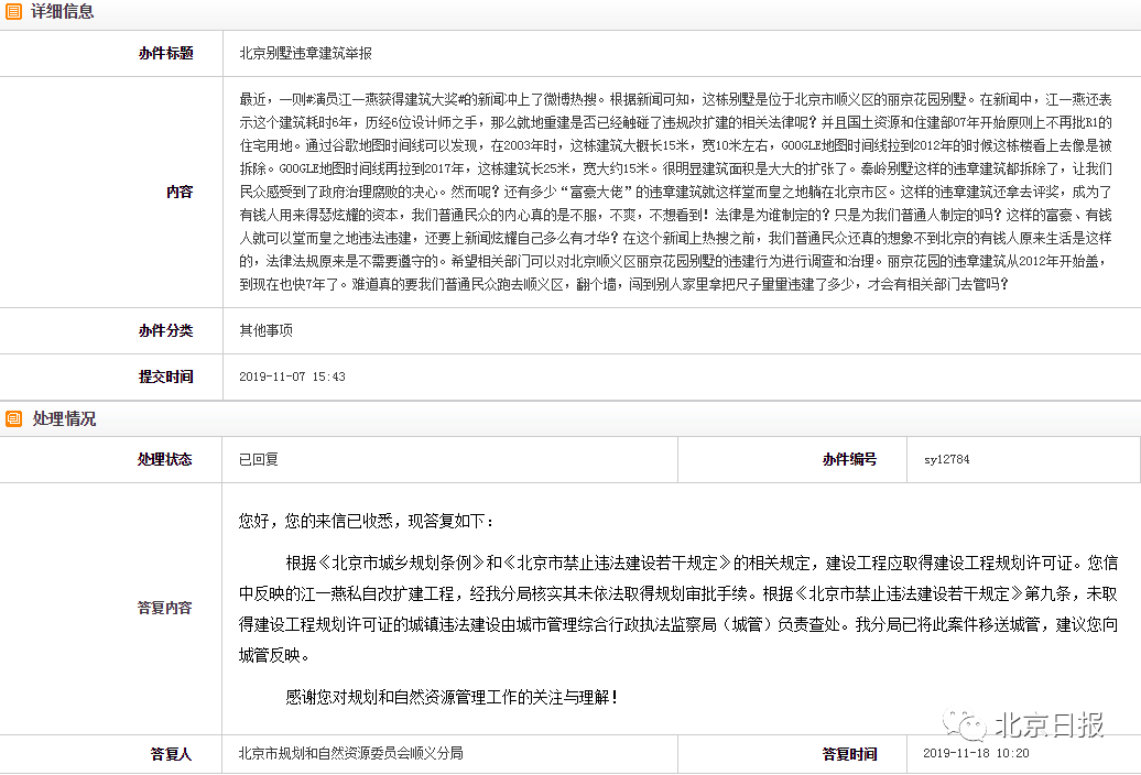 对此,北京市规划自然资源委顺义分局回应称,该涉事别墅经核实未依法取得规划审批手续,已移交城管部门处理。